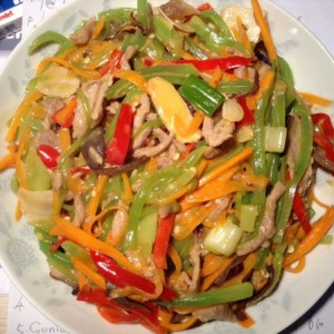 再加入“三丝”,一起爆炒!最后,倒入碗汁(蒸鱼豉油2勺,醋1勺,生抽1勺,料酒1勺,糖少许,温水50ml),起锅前,倒入水豆粉勾芡!