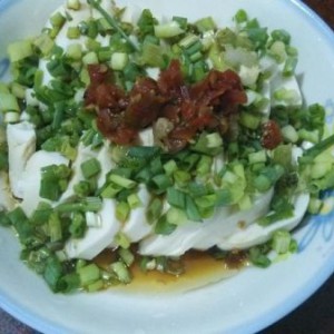切好葱花,撒在豆腐面上,放上剁椒。浇入生抽,麻油,好了( ̄▽ ̄")