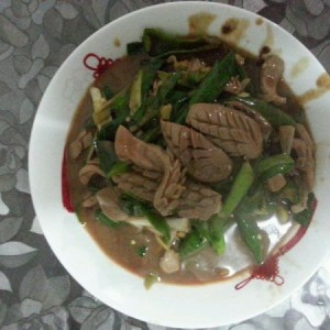 腰花剖成二半去除里面的粘膜及白色组织,用清水浸泡2小时去骚味,中间换一次水,捞出沥干切成条状,在一面切出花,加入淀粉(促鲜嫩),黄酒,大蒜末