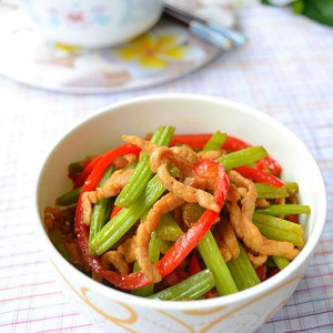 当肉丝变成白色后,将其拔到一边,下芹菜翻炒2分钟