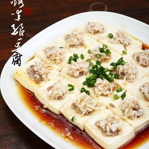将做好的豆腐入蒸锅蒸15分钟左右即可,最后放上葱花,并淋上