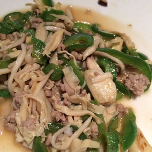 热锅烧油放大蒜,有香味后放入青椒、杏鲍菇翻炒,最后放入腐竹,加入已炒好的肉末,加盐,最后放入酱油!