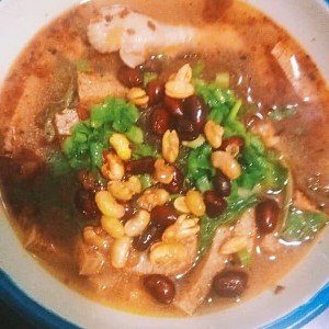 锅留一点儿汤 依次加入花椒粉 盐 鸡精 醋 生抽 辣椒油调味 导入碗中 撒上葱花香菜花生豆