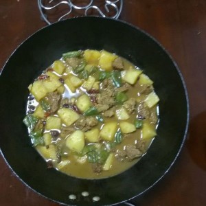 锅中倒油,油热后倒入配料(除青辣椒)爆香后倒入牛肉块翻炒,炒至托水后倒入生抽老抽料酒再翻炒,变色后加水闷煮至肉烂