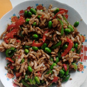 锅内倒入食量的油,油热后倒入肉丝爆炒后盛出后倒入黄豆炒至变色加入青椒红椒翻炒几分中后加入肉丝快速翻炒几下,加入一勺盐一勺糖,一勺生抽即可出锅!