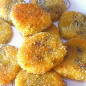 揉圆,捏扁,放在面包糠粉里,沾满面包糠,美味的南瓜饼就完工啦!