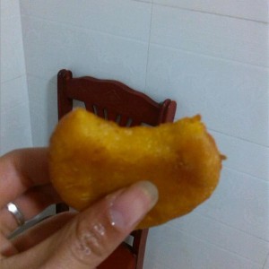 开始做南瓜饼,做完之后放入锅里炸,一定要用最低火,要不然容易糊。