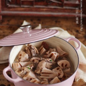 看锅中汤色变成奶白色,加入老藕、火腿片、黄酒、和葱。