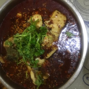 锅内烧油,油热,浇在器皿中,会有滋滋的声响,扑鼻而来的麻辣水煮鱼就可以享用啦