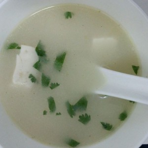 我是盛到碗里根据个人口味自己放盐,撒香菜沫,就可以喝了。