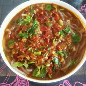 4 捞出红薯粉条放到碗里,浇入调好的汤,放蒜泥,香醋,撒上香菜即可。