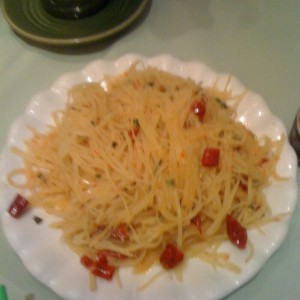 把土豆丝放入锅中,用中火爆炒,之后加醋,盐和糖。就可以出锅了。
