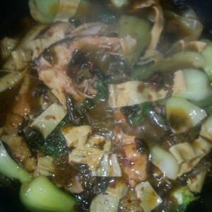 把酸菜上锅爆炒,腌好的鱼和水加入即可(我怕不够吃,还放了油皮年糕和油菜)
