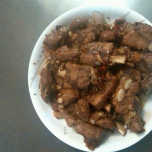 把蒸好的汤汁用碗盛好,把锅里放油,用蒜末炒出香味再把排骨和辣椒一起炒。