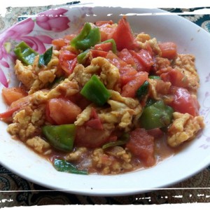 热锅温油下葱段,青椒,番茄块炒出汁,下入鸡蛋炒匀。加入盐、白糖翻炒均匀,最后加水淀粉勾薄芡出锅。
