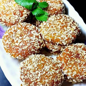 搅拌好以后,捏成一个个圆形,沾些面包糠油炸。