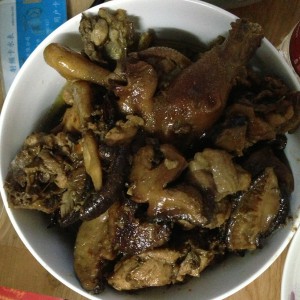 把油烧开把鸡块放入翻炒变色,加水与蘑菇