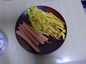 黄瓜,火腿肠,胡萝卜,都切成细条状,备用。