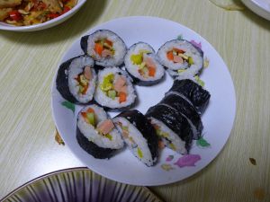 tip:米饭要一点点加,扑的薄一点,最后纵向要留出一条空白紫菜用于接合。