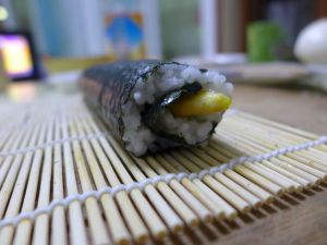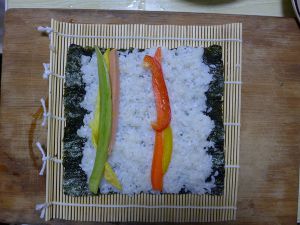 扑一张紫菜在竹帘上,将米饭均匀地扑在紫菜上。