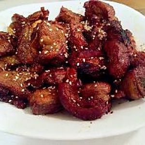 下排骨炸。这个过程可以较长一些,直到排骨颜色变深变焦。全程中火即可,不要用大火,免得糊。
