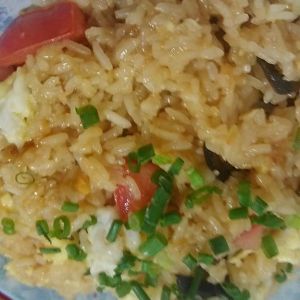 最后就是把炒好的鸡蛋和西红柿黑木耳一起入锅加与饭一起翻炒几下出锅撒上葱花开吃啦,要趁热好吃,