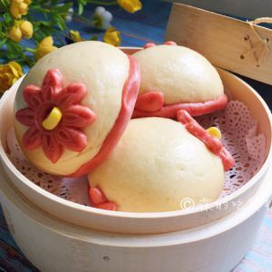 同理,发酵好的红色面团揉透后,取一小团搓成长条状,在馒头的底部外圈围一圈。