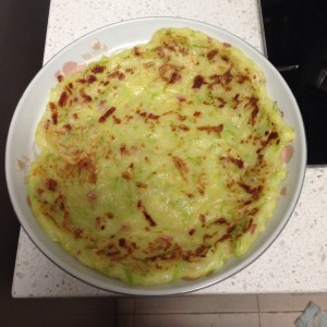 等西葫芦腌出水后 将面粉倒入盆中 并打鸡蛋打进里面 和成面糊 并将培根和奶酪切碎 放入面糊搅匀