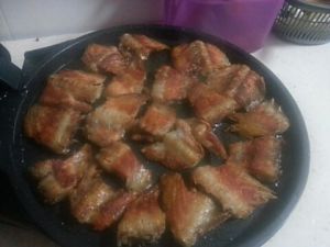 饼铛加热,放少许油,将鱼排均匀铺开,然后一面煎熟后再翻面煎