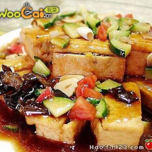 原汁放锅内,再加上汤、酱油、冬笋片、香菇片、青豆、火腿片、料酒、味精煮滚,抹去浮沫,用薯粉水勾芡,加上葱油搅匀,浇在豆腐箱上即可。