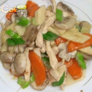 烧开后倒入鸡片,蘑菇片,下水淀粉勾芡,出锅装盘,撒上火腿末即成