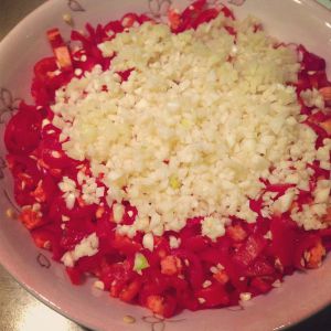 蒜和姜都剁成碎末和糖、盐、高度白酒一起放入辣椒中拌匀。