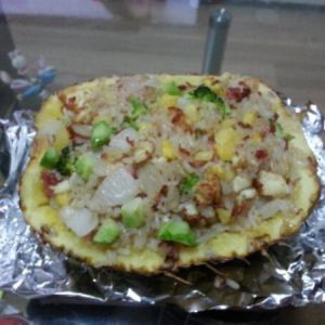 将炒饭装入菠萝壳中,入烤箱210度10分钟。大功告成了!