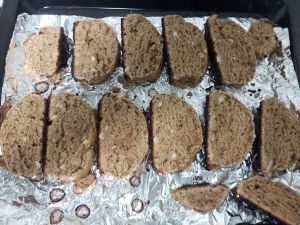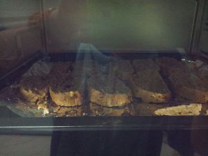 170度.烤25分钟.表面呈黄色.因为有咖啡粉,看不出是否呈黄色,所以应该多留意.拿出后凉凉.切成一厘米厚.平铺烤盘