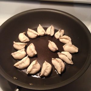 锅里放油,把饺子放好!中火煎一分钟!(用筷子翻看饺子底部微微发黄)
