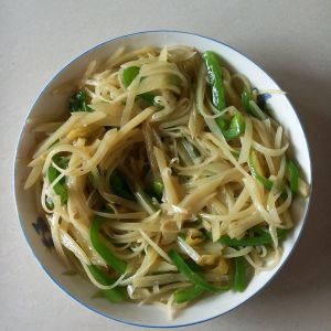 锅热后,倒入油,油熟,加入蒜末、野山椒、姜末、盐,翻一翻,倒入土豆丝翻炒几下,倒入青椒丝翻炒,加一点水从锅的四周浇下,翻炒一会儿,装盘
