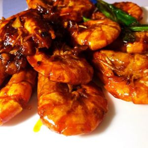 待锅内汤汁收得差不多了,将大虾摆盘盛出。汤汁可淋在上面,颜色超级漂亮。快来品尝吧