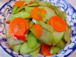 锅里加少许油,放蒜片爆香后,倒入菜心、西芹、胡萝卜翻炒。