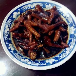 洗净的鸡爪重新放入锅内加水直至覆盖鸡爪,加一汤匙料酒,4汤匙老抽,2汤匙生抽,生姜片和冰糖。