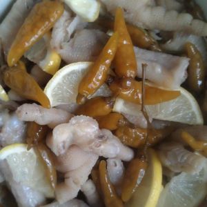 煮的同时,调泡椒水,拿出5-6个泡椒,切碎出辣味放在容器底部,柠檬切片,一半也垫在容器底部,把泡椒水倒入容器