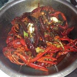 放油,多一点,七成热时放入麻椒和红辣椒蒜瓣姜片煸香,放入郫县豆瓣炒香后倒入龙虾翻炒,倒入啤酒、放入香料,烧开后放入冰糖,放盐和鸡精调味,小火炖20分钟左右,大火收下汁(稍微收下即可)