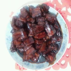 改回炒锅大火放冰糖使汁粘稠即可出锅,香葱段点缀。(汁浓味香,浇在米饭上超过瘾。)