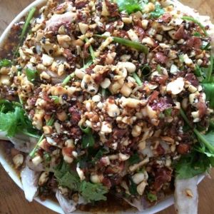 将辣椒放在碗里,锅洗净之后放两勺油,放少许花椒,煮出味道后将花椒取出,再将油煮沸,然后到在辣椒粉里,接着放入蒜蓉,姜汁,然后倒一小碗鸡汤,倒入之前准备好的花生及芝麻倒入酱料里面,再淋到鸡肉上,洒上葱花及香菜即可