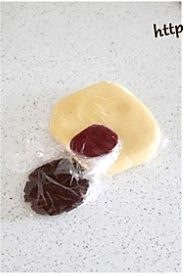 分别取少量面团与可可粉和红曲粉混合捏匀,所有面团用保鲜膜包裹好,冷藏2小时。