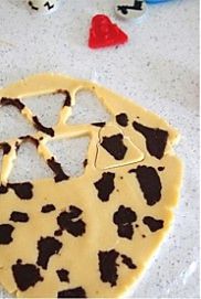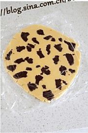 取出将原味面团擀成0.3 cm厚,巧克力面团捏成小块粘在原味面团上,再盖上一层保鲜膜,轻擀平。