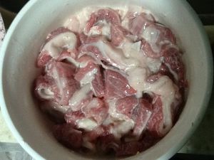 将猪板筋切成一厘米宽的段,用嫩肉粉、胡椒粉、少许盐、料酒腌制五分钟。