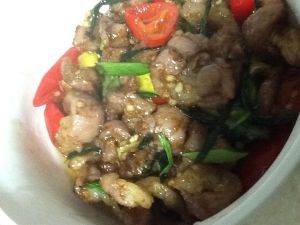锅中油温九成热倒入猪板筋,变色卷曲立即捞出,剩余油中放泡椒、青蒜炒香,再加入板筋,淋少许生抽、糖、味精,出锅。