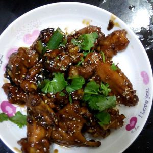 待鸡翅要熟时加入适量的可乐,煮至可乐完全融入鸡翅中。。最后收汁。撒上芝麻。