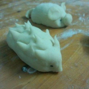 面发好后,加少许面粉和一点苏打粉(这个只能一丁点地加)揉,闻到没有酸味可以好好地揉。然后做成自己想做的模型。