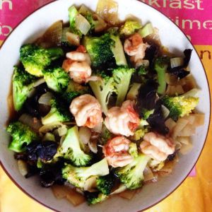 炒锅放1汤勺油,洋葱入锅炒香,放入虾仁,加少许酱油,一起翻炒至虾仁变色,将之前的西兰花和木耳一起入锅翻炒,最后加入淀粉水,出锅前淋入几滴香油拌匀出锅盛盘,好吃又营养。